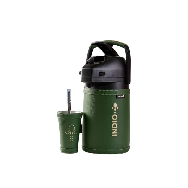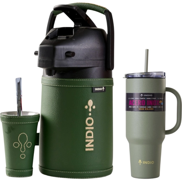 ¡COMBO MARKETPLACE! TERMO TERERE INDIO 1.9 LT SIMIL CUERO VERDE INGLES + VASO VIAJERO VERDE 1.1 LT
