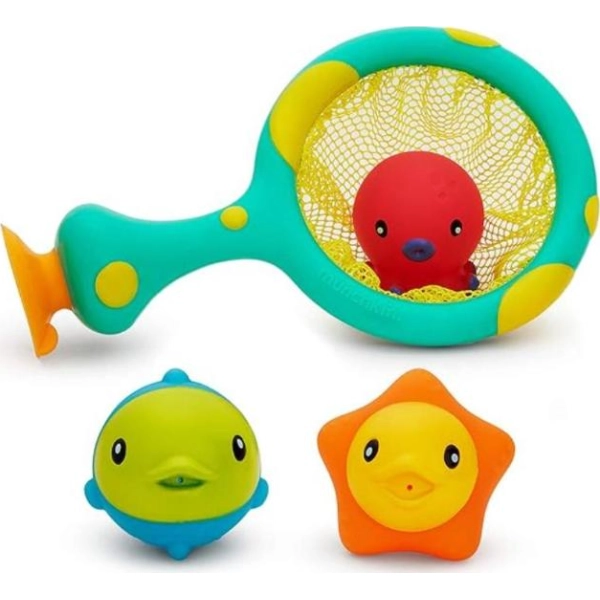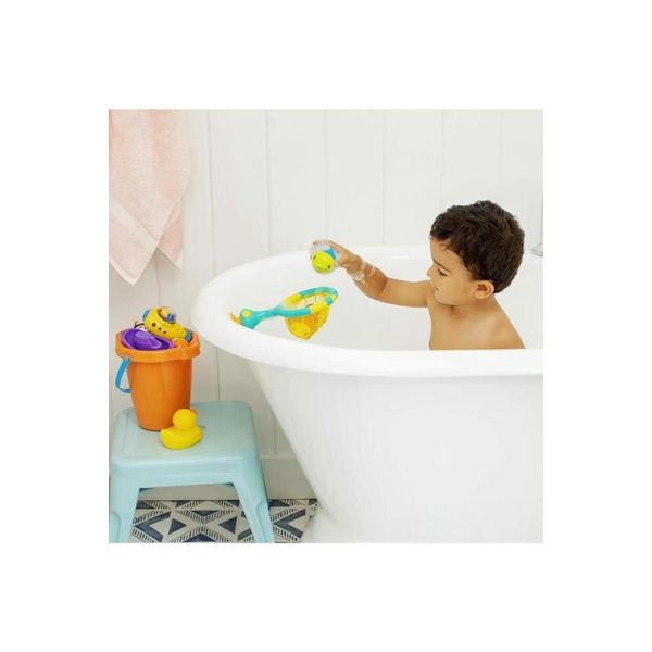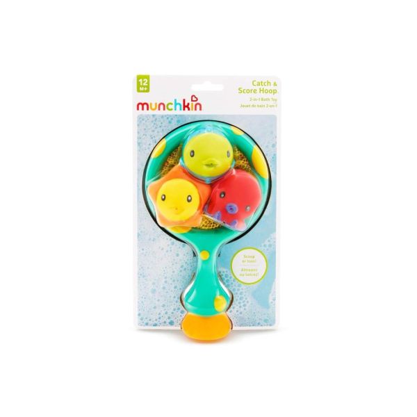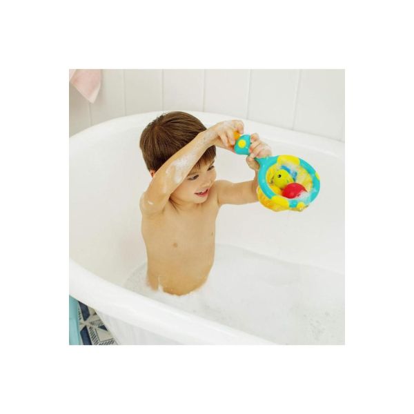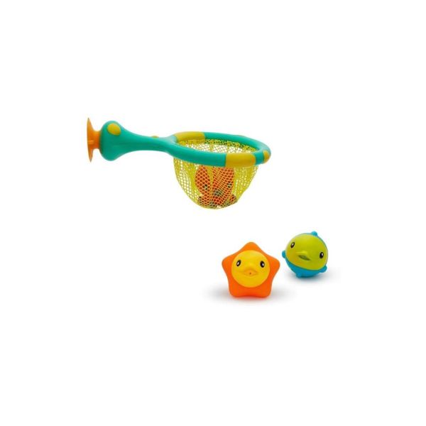 Recoge personajes flotantes o usa la ventosa en la pared de la bañera para un juego de baloncesto a la hora del baño. Viene con 3 bolas de goma con personajes que flotan y arrojan agua. Ideal para desarrollar la coordinación ojo-mano.