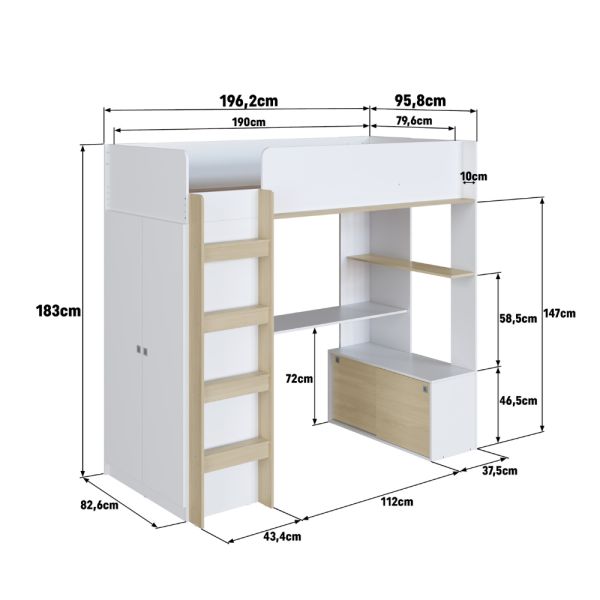 Incluye un escritorio con estante integrado, mostrador con puertas correderas y un armario lateral, ideales para mantener organizados los útiles escolares, ropa o accesorios personales. Además, su escalera lateral reversible permite adaptar el mueble al espacio disponible, montándose a la derecha o a la izquierda según conveniencia.