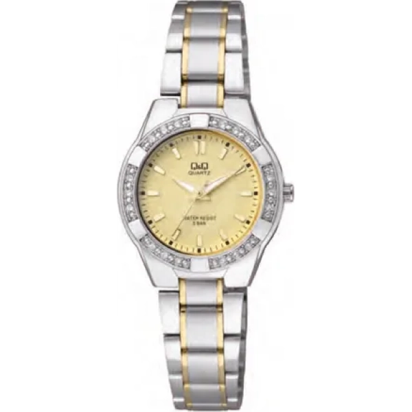 Reloj de la marca Q&Q para dama, resistente al agua de acero inoxidable, mixto (dorado y plateado) fondo negro/beige. Consultar disponibilidad. A pila y strass mide 20cm de largo y 2,7cm de diámetro.